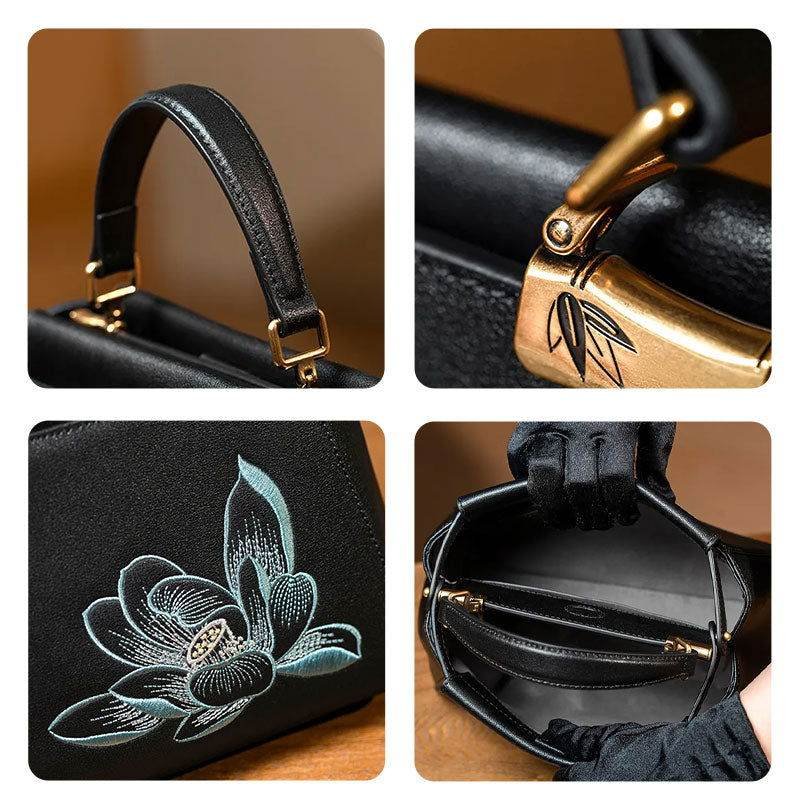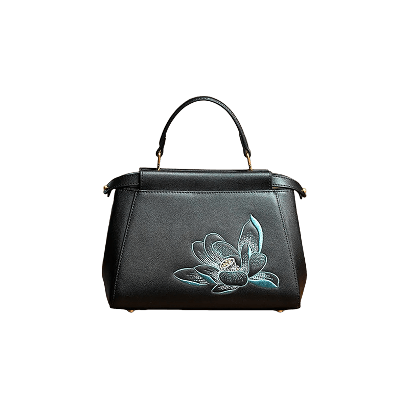 Embroidery Leather Mini Bag Black Lotus Handbag