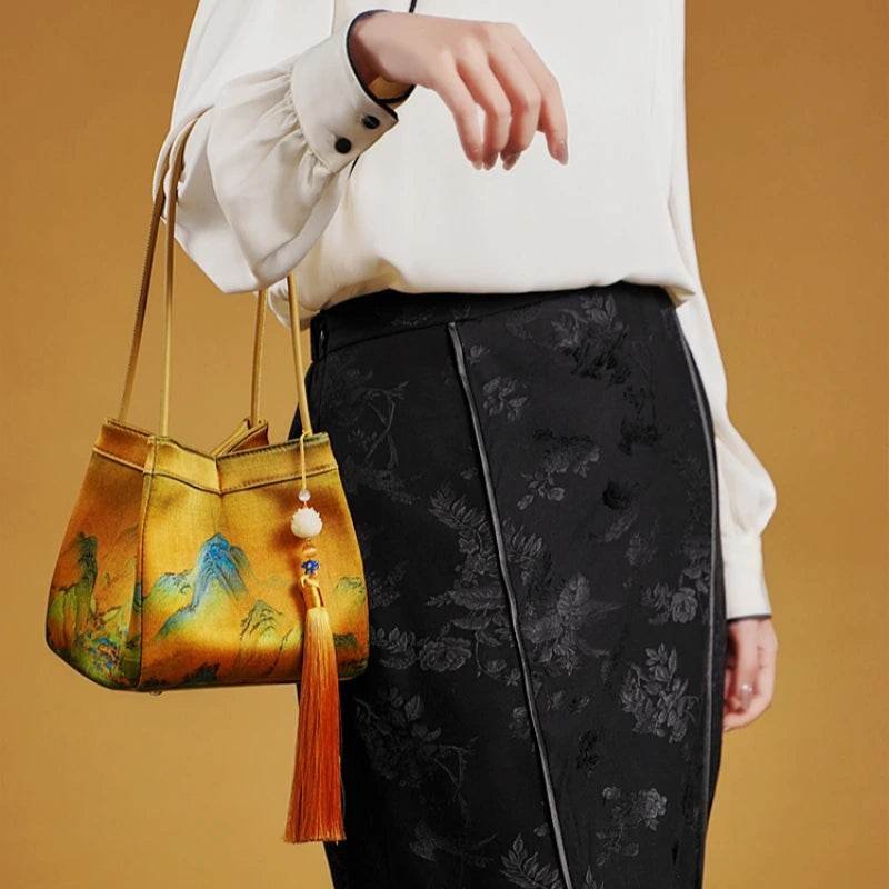 Chinese Painting Mulberry Silk Bucket Bag Vintage Handbag