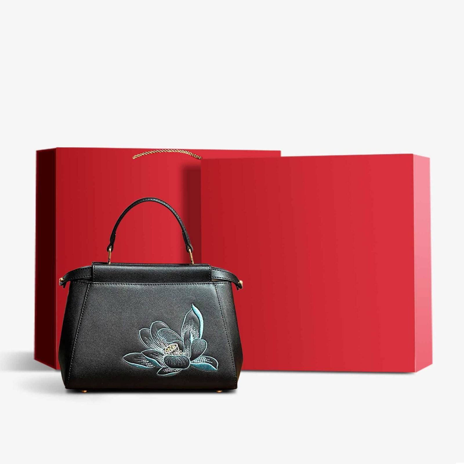 Embroidery Leather Mini Bag Black Lotus Handbag